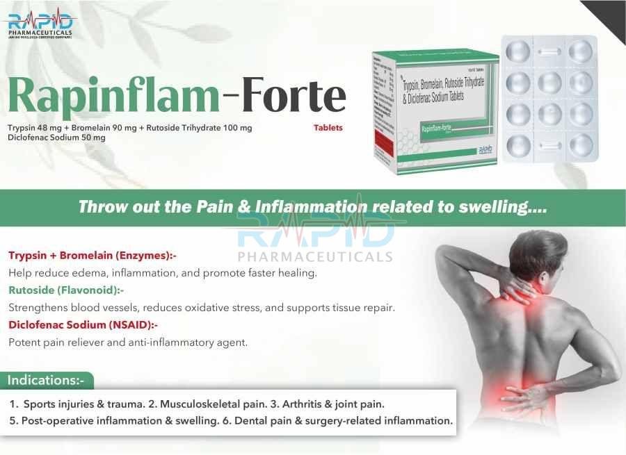 Our Rapinflam Forte tablets are a powerful combination of Trypsin, Bromelain, Rutoside Trihydrate, and Diclofenac Sodium, designed for anti-inflammatory and pain relief purposes. Each tablet contains Trypsin BP 48mg, Bromelain BP 90mg, Rutoside Trihydrate BP 100mg, and Diclofenac Sodium IP 50mg. Manufactured by Rapid Pharmaceutical, these tablets come in a convenient packing size of 10x10 tablets. Ideal for suppliers and traders in the healthcare industry looking to offer effective solutions for inflammation and pain management.