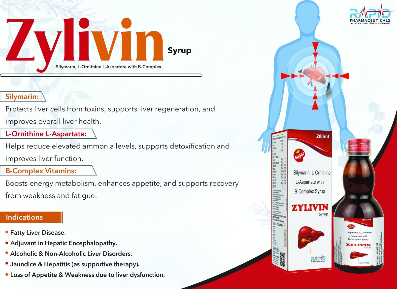 We offer Zylivin Silymarin L-Ornithine L-Aspartate B Complex Syrup in a convenient liquid form packed in a 200ml bottle. Manufactured by Rapid Pharmaceuticals, this syrup is designed to support liver health. Zylivin contains a blend of Silymarin, L-Ornithine, L-Aspartate, and B Complex vitamins to promote overall liver function. Ideal for suppliers and traders in the health industry, this product is a reliable choice for those seeking quality liver support supplements.
